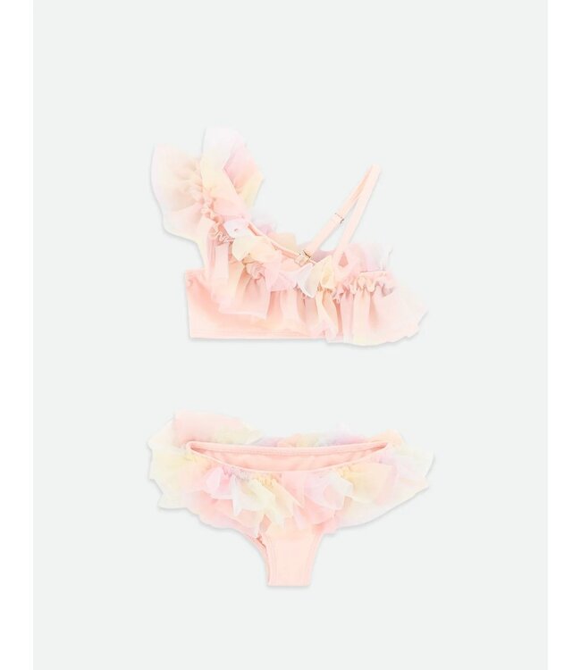 Angel's Face bikini met een speelse regenboog tule afwerking voor een unieke en kleurrijke uitstraling. De one-shoulder bikini top biedt een trendy en elegante look, perfect voor zonnige dagen en strandplezier.
