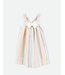Angel's Face jacquard jurk met elegante verticale pastel- en gouden strepen. Afgewerkt met een verfijnde witte strik in het midden van de kraag. De open rug met kruisende bandjes geeft een stijlvolle en unieke touch aan deze luxueuze jurk.