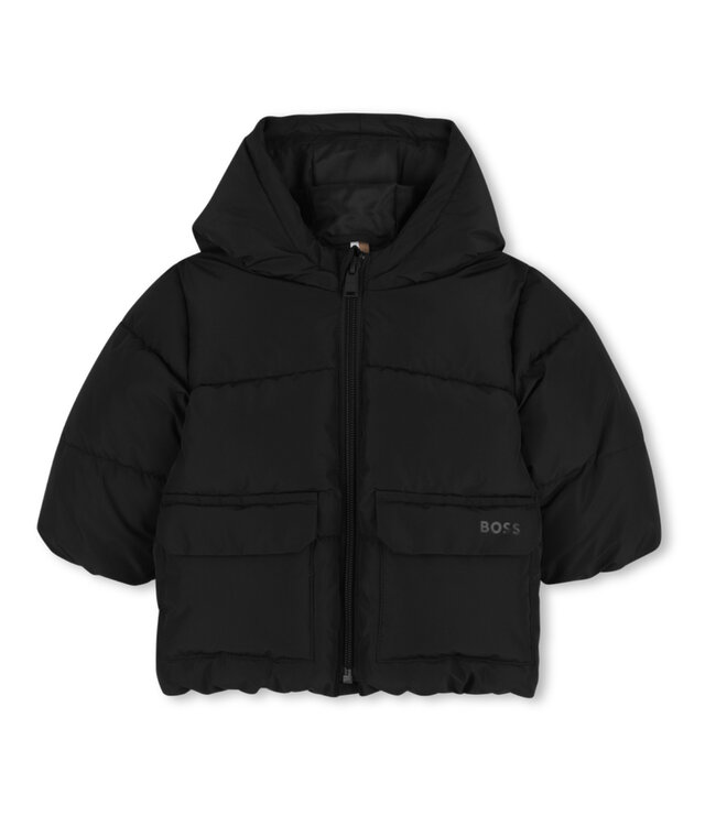 Zwarte BOSS baby jas met warme gewatteerde voering, capuchon met licht koekiebruine binnenkant en grote zakken. Stijlvol, comfortabel en perfect voor koude dagen. Praktisch met ritssluiting en zachte afwerking.