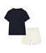Trendy BOSS baby set met een Navy T-shirt en beige shorts. Het T-shirt heeft een opvallend grafisch ontwerp en een subtiel BOSS-logo. De shorts zijn gemaakt van comfortabel materiaal en hebben een elastische tailleband.
